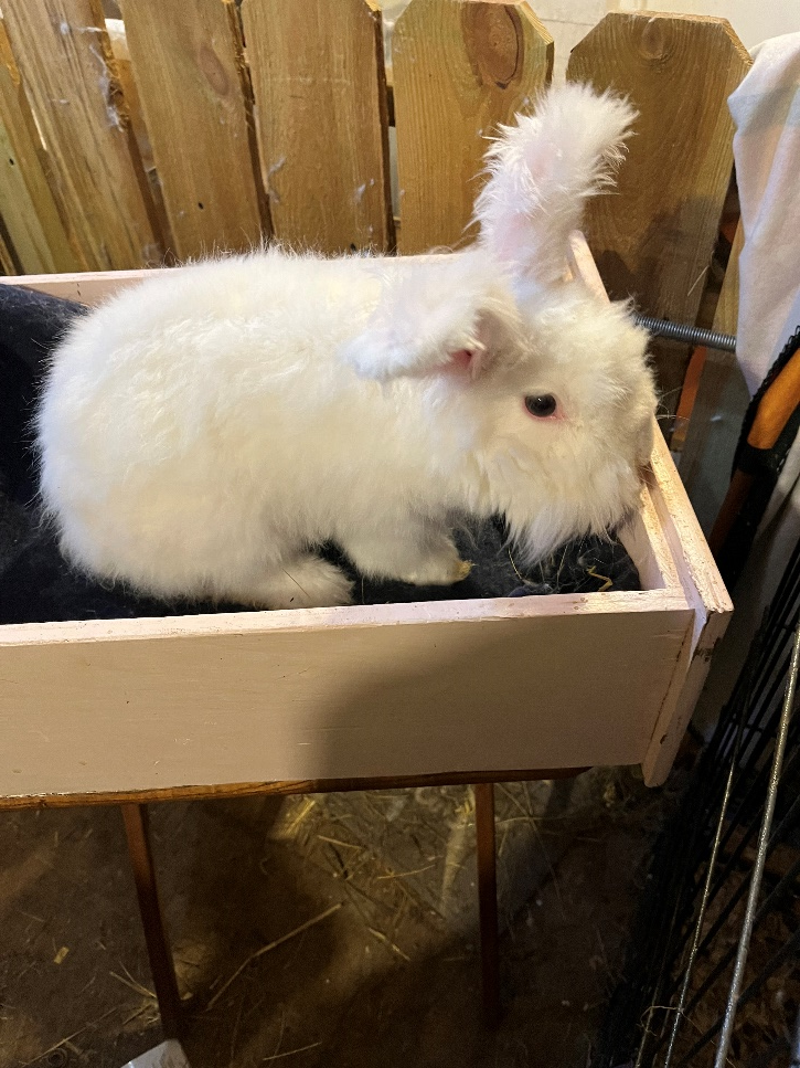 The English Angora rabbit is known for its very long, very soft wool, but they are a small, delicate rabbit that does require a lot of care to maintain their wool. Combing, brushing and/or blowing out the wool weekly or more often may be more challenging and time consuming but is required to prevent matting. The shearing is done 3-4 times a year as their wool grows fast. They also have special dietary requirements for healthy wool growth and gut health.